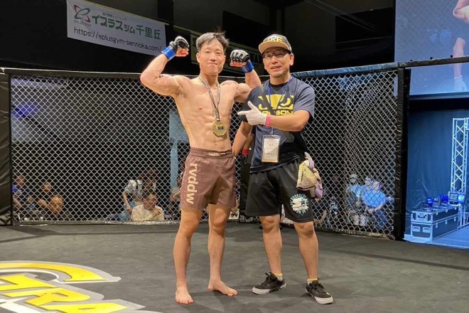 ※フェザー級優勝のTKジム 磯田選手、ライト級準優勝 ゴンズジム金谷選手との直心ファミリー。